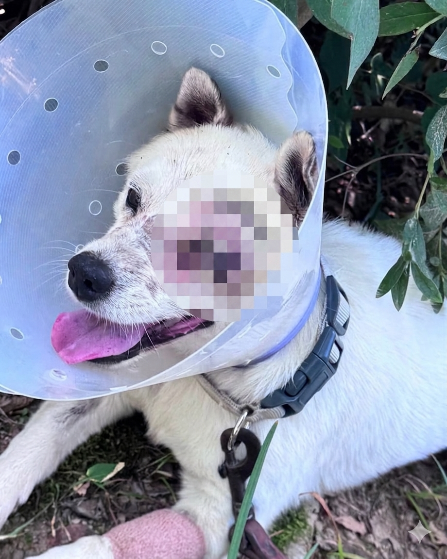 | 지난해 6월 경남 거제에서 20대 남성 3명의 비비탄 총 난사로 안구 적출 등 상해를 입은 반려견. [비글구조네트워크 인스타그램 캡처] |
