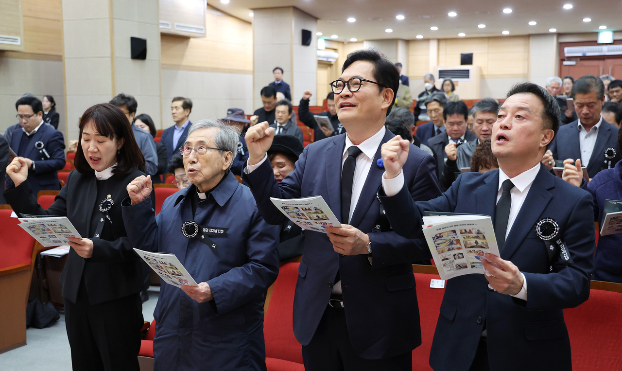 | 10일 서울 동작구 국립서울현충원 현충관에서 열린 운암 김성숙 선생 제57주기 추모제에서 참석자들이 독립군가를 부르고 있다. 앞줄 왼쪽부터 강윤진 국가보훈부 차관, 함세웅 항일독립선열선양단체연합 회장, 더불어민주당 송영길 전 대표, 윤준호 전 의원 [연합] |