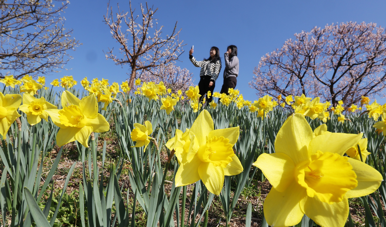 | 완연한 봄 날씨를 보인 8일 경기도 용인시 에버랜드 하늘정원길에 수선화와 매화가 활짝 피어 있다. [연합] |