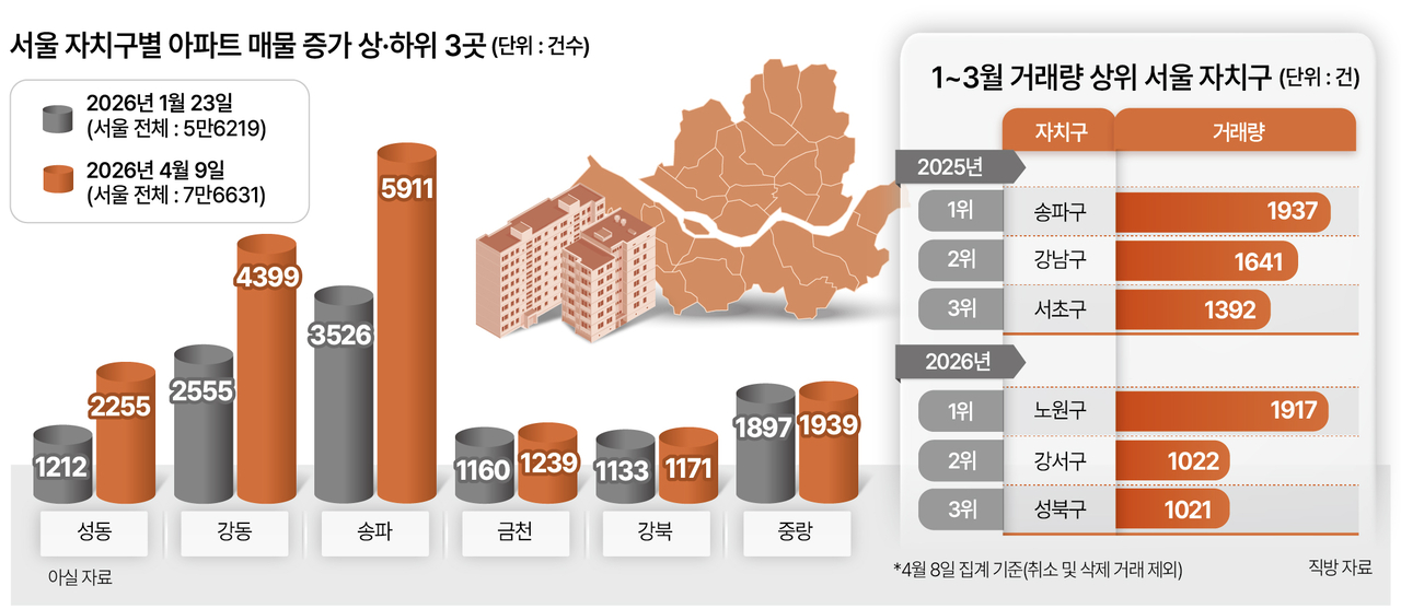관건은 서울 내에서도 정부의 단기 공급책의 효과가 지역별로 다르게 나타나고 있다는 점이다. 실제 헤럴드경제가 아실 데이터에 기반해 1월 23일과 4월 9일 사이 25개 자치구별 매물 수 증감을 비교한 결과, 성동구(1212건→2255건) 아파트 매물은 86% 급증했지만 중랑구(1897건→1939건)는 2.2% 증가에 그쳤다. 증가율 기준 40배 가까운 차이다.