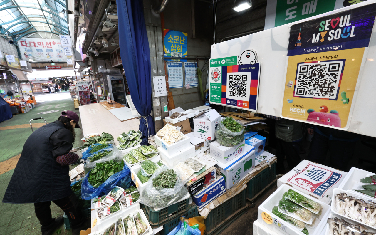 | 서울 마포구 망원시장의 한 상점에 서울페이와 온누리상품권 등 QR코드 안내문이 붙어있다. [연합] |
