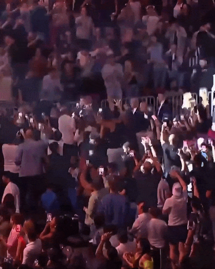 그는 데이나 화이트 UFC 회장과 함께 록 그룹 ‘키드록’의 노래가 울려퍼지는 가운데 마르코 루비오 국무장관이 기다리고 있는 자리로 들어섰고 해설자석에 앉아 있던 조 로건과도 이야기를 나눴다.