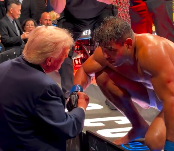 [헤럴드경제=문영규 기자] 도널드 트럼프 미국 대통령이 미국과 이란의 종전협상이 결렬될 당시 플로리다주 마이애미에서 이종격투기(UFC) 경기를 관람한 가운데, 참가 선수와 얘기를 나누는 장면이 포착돼 관심을 모으고 있다.