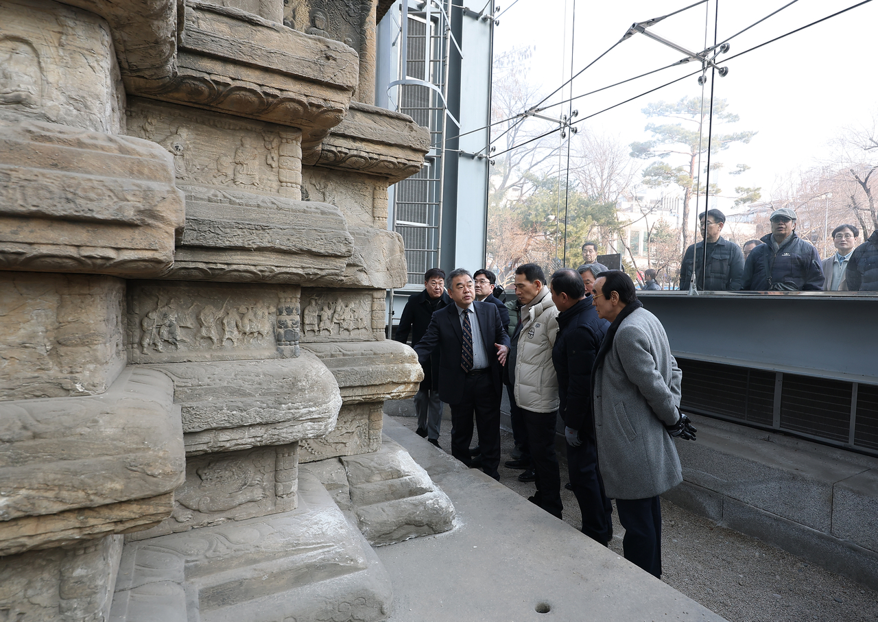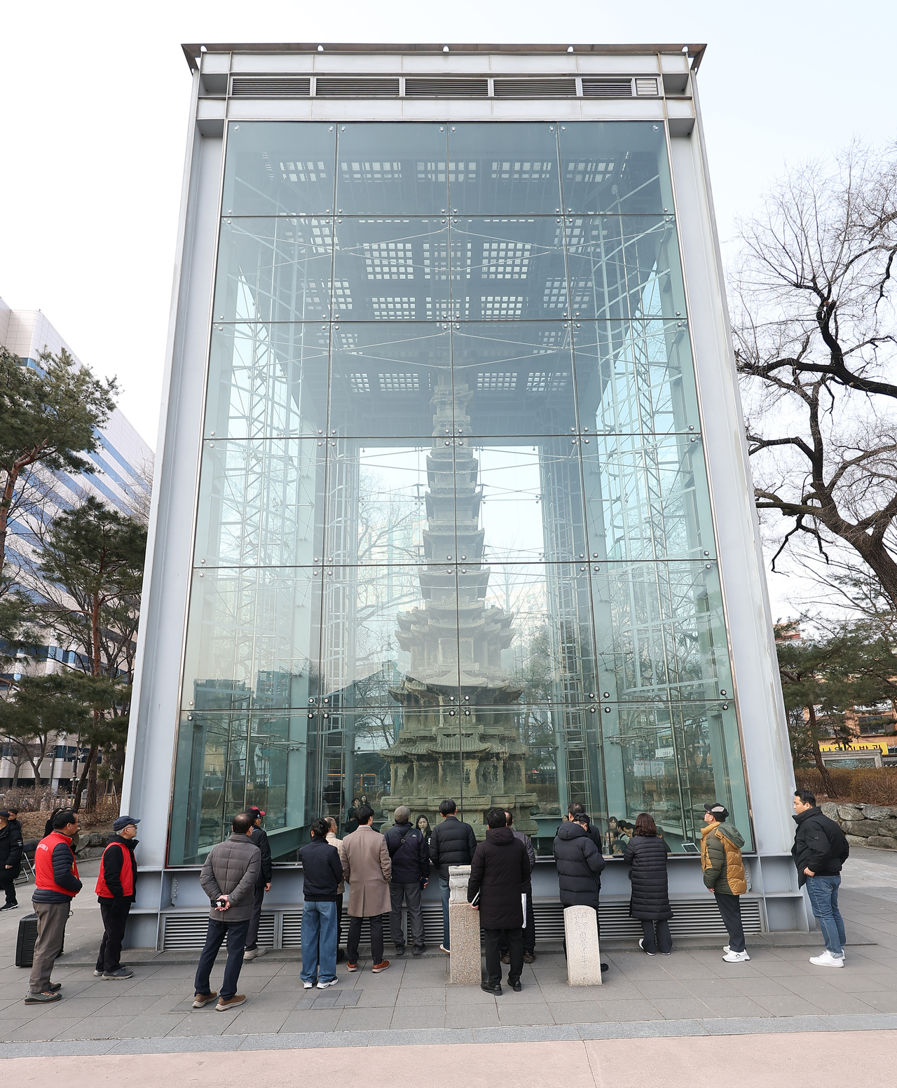 | 올해 2월 20일 서울 종로구 탑골공원에서 진행된 국보 ‘원각사지십층석탑’ 유리 보호각 내부 공개 관람. [연합] |