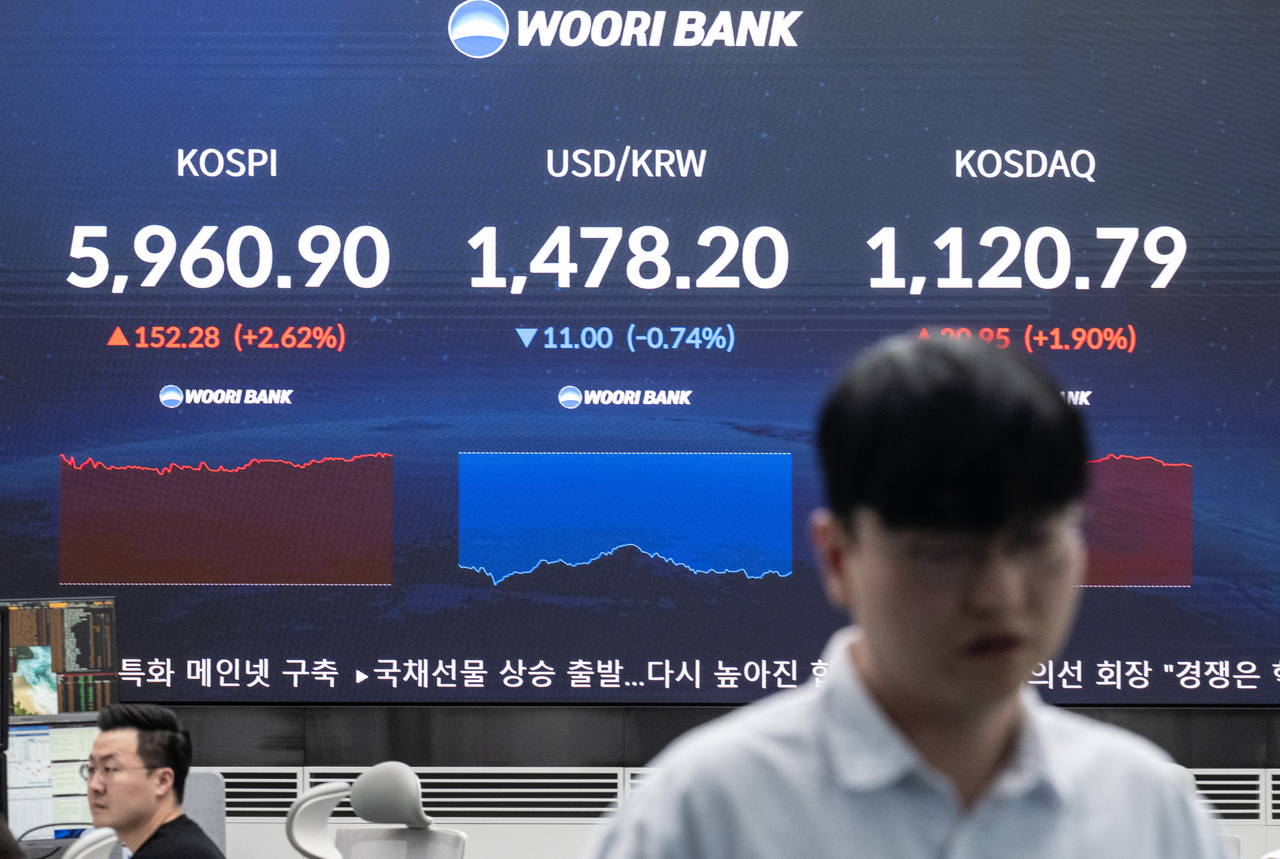 이날 오전 9시15분 현재 코스피는 전장보다 146.28포인트(2.52%) 오른 5954.90에 거래되고 있다.