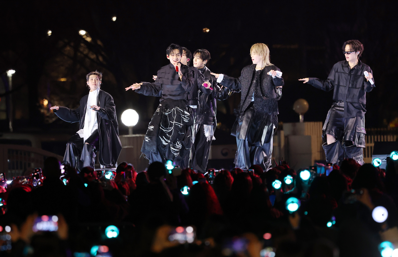 | 그룹 방탄소년단(BTS)이 지난 21일 서울 광화문 광장에서 정규 5집 ‘아리랑’(ARIRANG) 발매를 기념해 무료 공연 ‘BTS 컴백 라이브: 아리랑’(BTS THE COMEBACK LIVE|ARIRANG)을 열고 있다. [연합] |