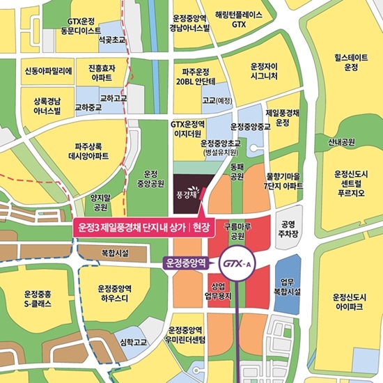 입지적 장점도 뚜렷하다. 일단, 운정3 제일풍경채 단지내 상가의 경우 역세권 길목에 위치한 길목 상권이다. 운정중앙초등학교 및 병설유치원, 운정중앙중학교가 단지와 인접해 학생과 학부모의 보행 동선이 상가 전면과 맞닿아 있다. 또한, 운정신도시의 나들이 명소로 알려져 있는 운정중앙공원과 동패공원이 단지 앞에 위치해 입주민뿐만 아니라 주말 나들이객 등 풍부한 배후 수요를 확보할 수 있다.