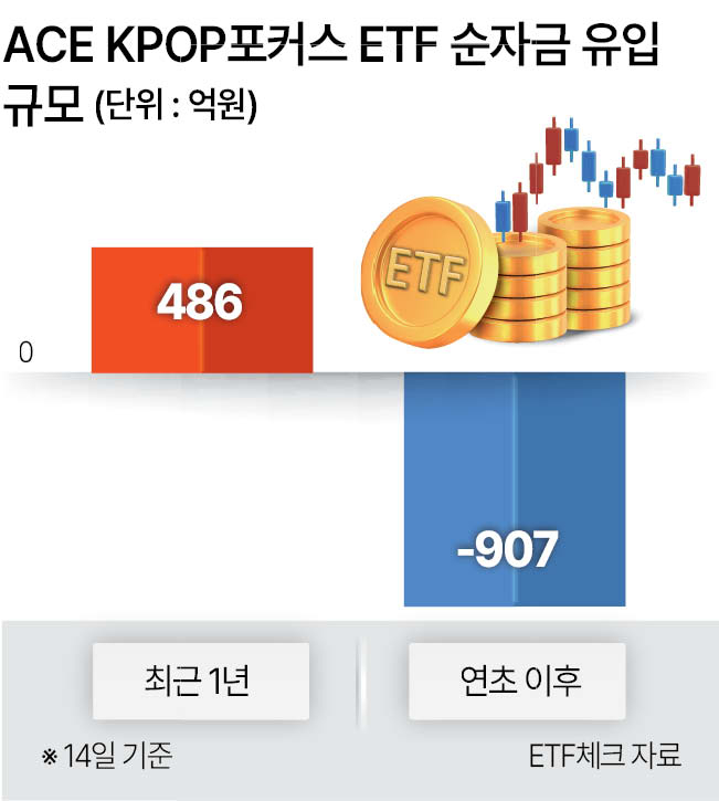 관련 ETF도 올해 들어 자금 이탈이 눈에 띈다. 이날 코스콤 ETF체크에 따르면 전날 기준 ‘ACE KPOP포커스 ETF’에서는 연초 이후 900억원 이상 자금이 순유출됐다. 같은 기간 수익률은 -25%를 기록했다. 해당 ETF는 지난 1년간 순자금 유입 486억원을 기록했지만, 올해 들어 흐름이 반전되며 900억원 넘는 자금이 순유출됐다.