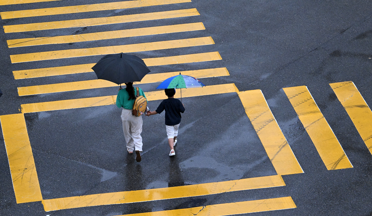 | 모자가 우산을 쓰고 횡단보도를 지나고 있다. 임세준 기자 |