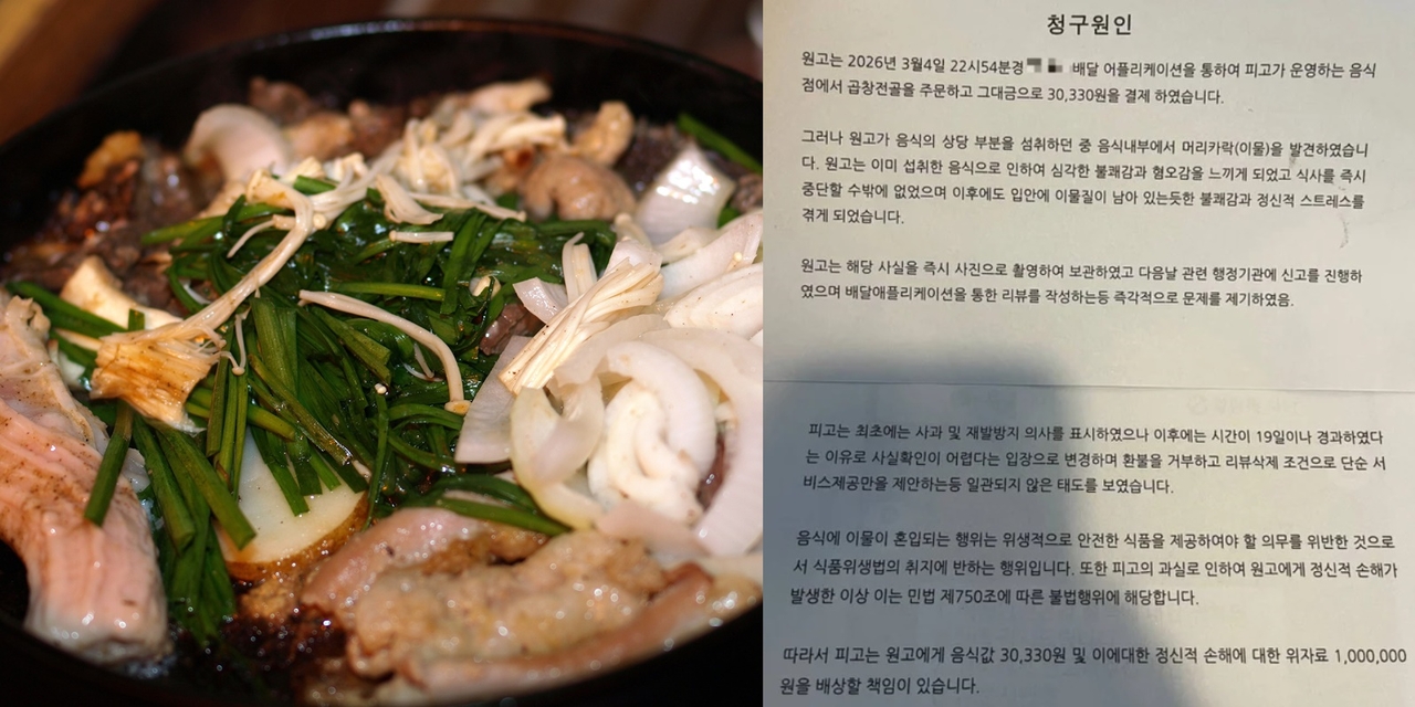 손님이 보낸 소장에는 “곱창전골을 주문해 3만300원을 결제했고, 음식을 상당 부분 섭취하던 중 머리카락을 발견해 심각한 혐오감과 불쾌감을 느꼈다”는 내용이 담겼다. 이어 “식사를 중단할 수밖에 없었고 이후에도 입안에 이물감이 남아 있는 듯한 불쾌감과 정신적 스트레스를 겪었다”며 음식값과 위자료 100만원을 청구했다.