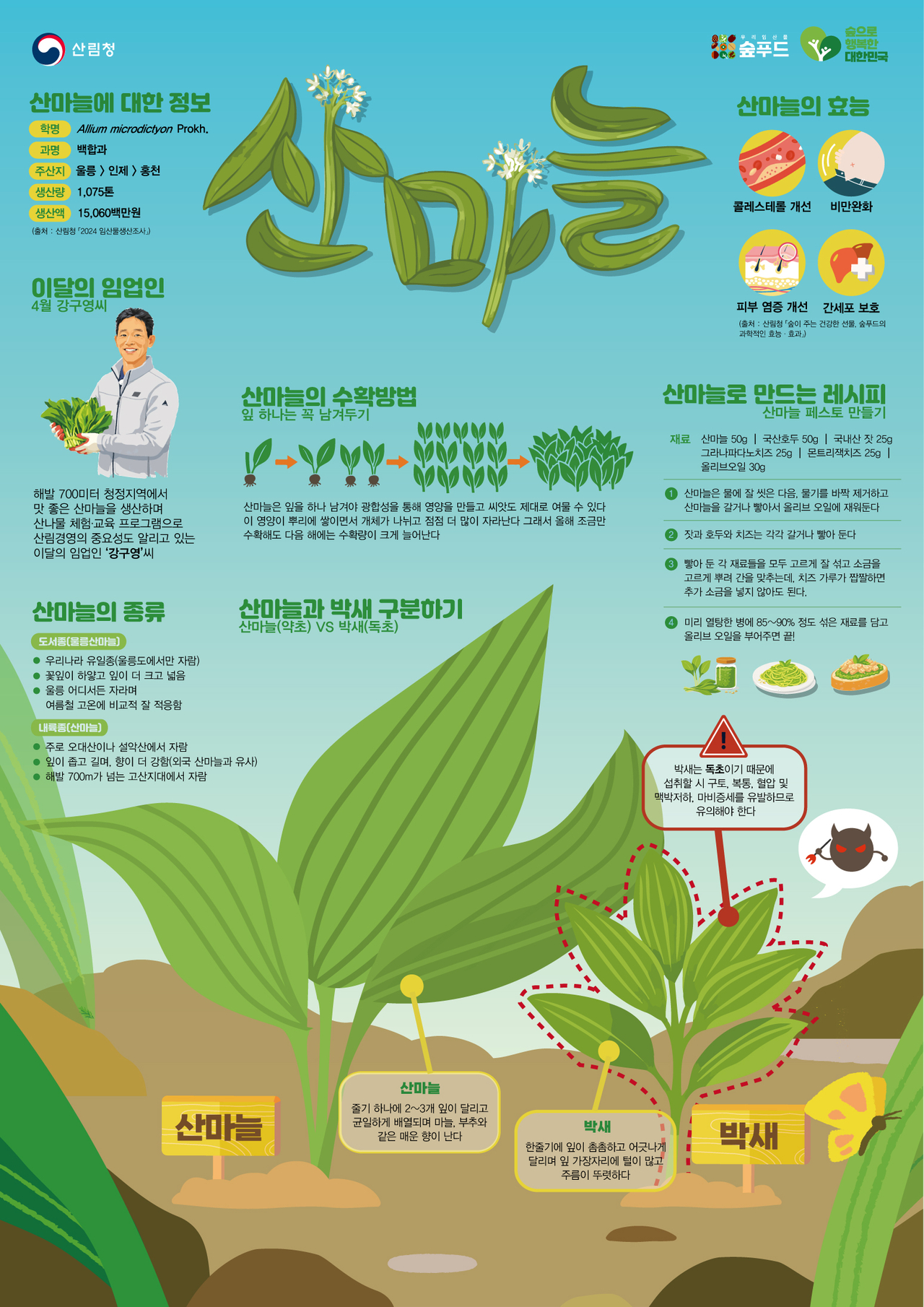 이상익 산림청 산림산업정책국장은 “산마늘은 짧은 시기에만 만날 수 있는 봄철 대표 임산물로, 올바른 수확과 관리가 함께 이루어질 때 그 가치가 더욱 높아진다”며 “제철 산마늘을 통해 우리 임산물의 우수성을 경험해 보시길 바란다”고 말했다.
