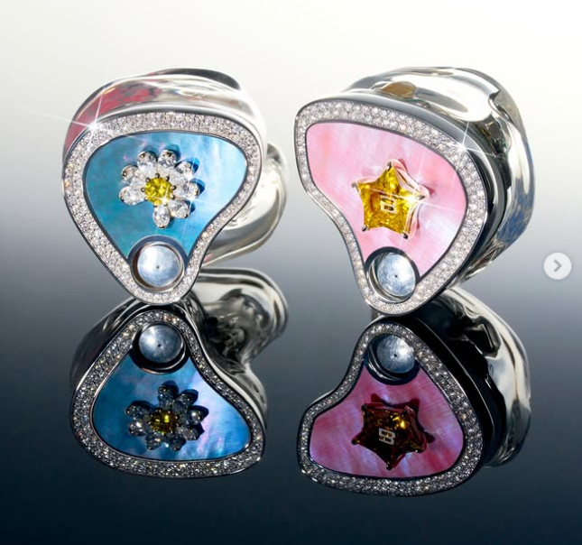 한쪽에는 지드래곤이 전개하는 브랜드 ‘피스마이너스원’의 시그니처인 데이지 꽃이 옐로 다이아몬드와 화이트 스톤으로 정교하게 표현됐고, 다른 한쪽에는 빅뱅 응원봉을 모티브로 한 별 형태 장식이 동일하게 옐로 스톤으로 세팅됐다. 블루와 핑크 톤의 바탕 컬러가 대비를 이루며 감각적인 디자인을 완성했다.