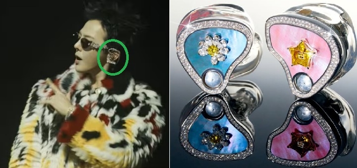 공개된 사진을 보면 지드래곤 인이어는 무대 장치라고 보기 어려운 호화로운 비주얼의 주얼리에 가깝다. 실버 베이스 위에 촘촘하게 세팅된 다이아몬드로 테를 둘렀고, 가운데에는 각각 상징적인 오브제가 담겼다.