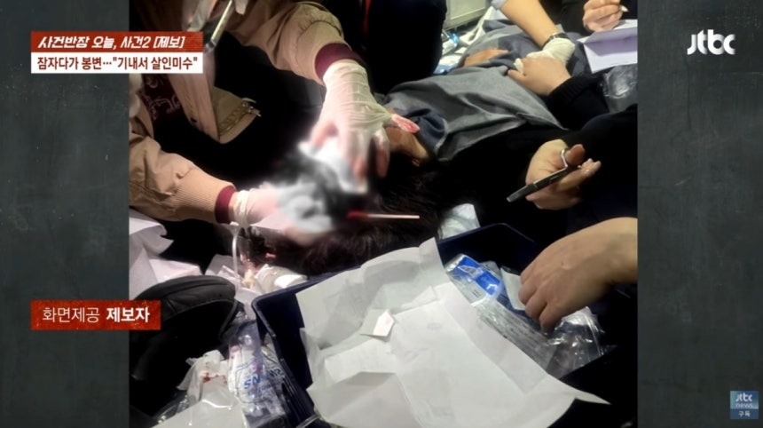 | 폭행을 당한 B 씨가 기내에서 수술받는 상황.[JTBC ‘사건반장’ 캡처] |