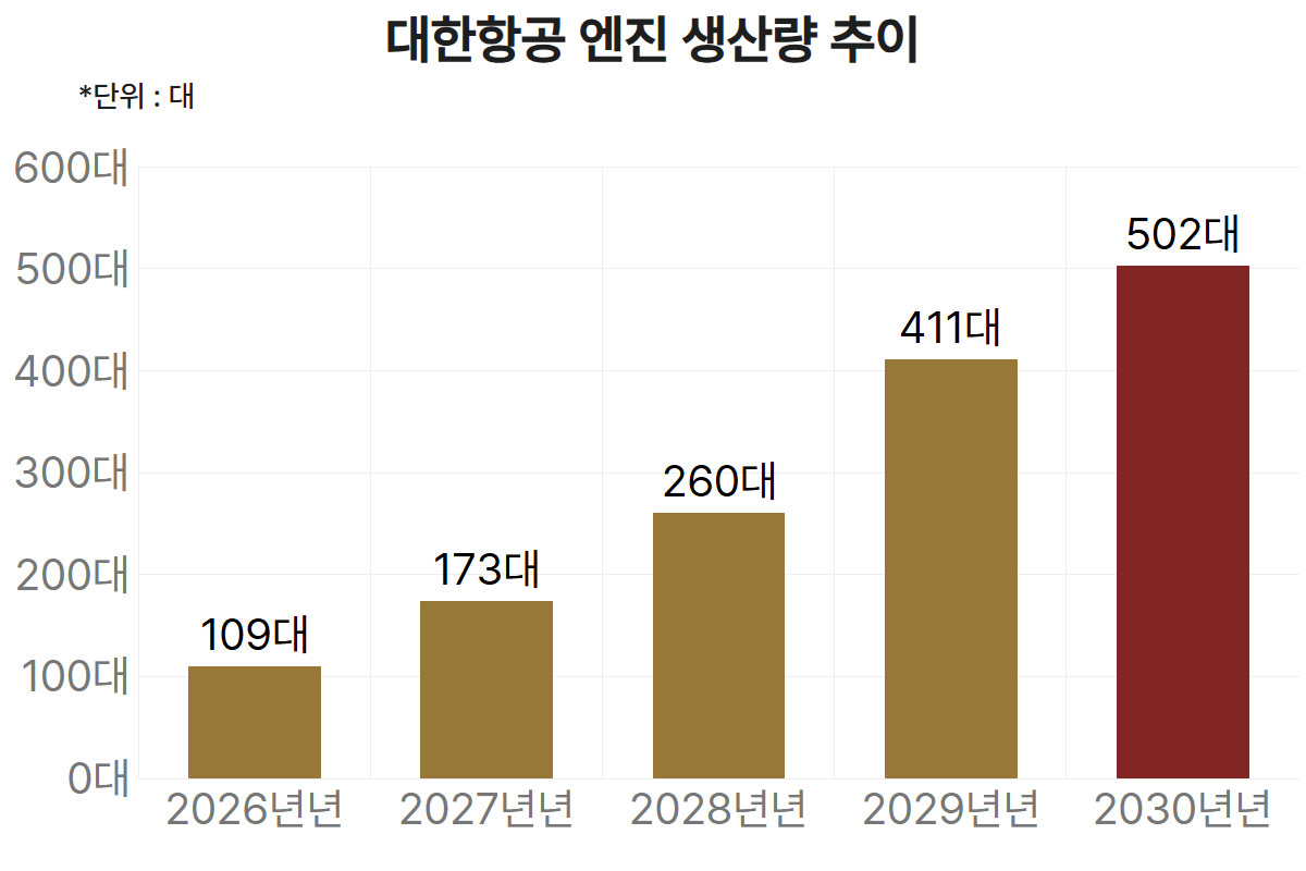 대한항공의 올해 엔진 정비 생산 계획은 116대 수준이다. 부천에 분산된 엔진 정비 기능을 운북지구로 통합하고, 정비 가능한 엔진 기종을 확대해 오는 2030년에는 생산 능력을 500대 이상으로 끌어올릴 계획이다. 현재 6종인 정비 가능 엔진 모델도 2030년까지 12종으로 늘린다.