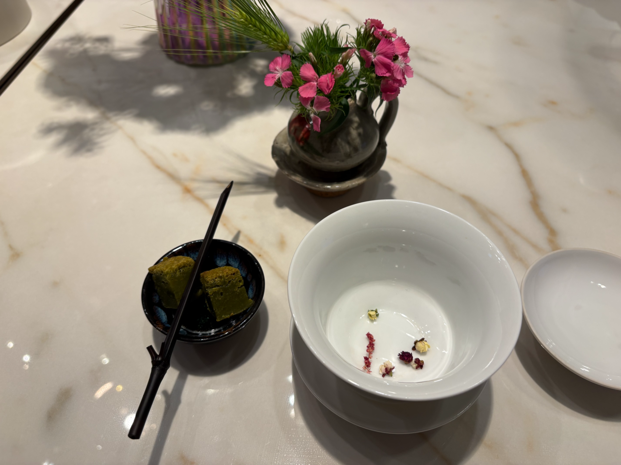 눈을 감고 따뜻한 찻잔을 느끼며 호흡을 가다듬으니 시음 차례가 왔다. 단전에 찻잔을 뒀다가 입으로 옮겨 조금씩 나눠 마셨다. 명상을 하는 동안 매화 향이 충분히 우러나온 꽃차는 입안을 향긋하게 씻어냈다. 디저트로 곁들인 녹차 브라우니와 조합이 좋았다. “녹차가 맞느냐”는 질문도 나왔다.