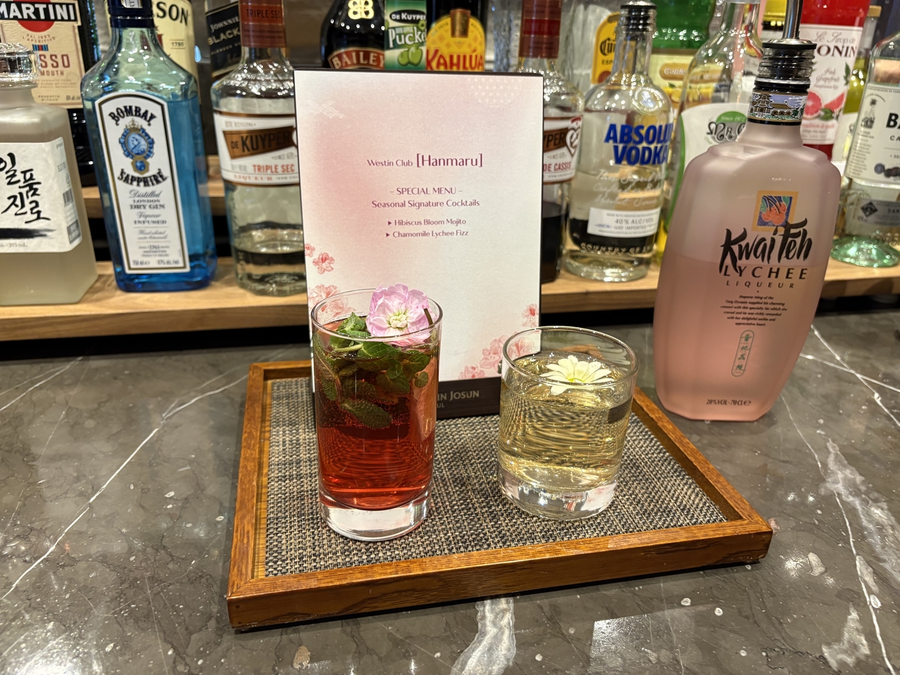| 지난 15일 서울 중구 웨스틴 조선 서울 웨스틴클럽에서 해피아워 시간에 제공된 꽃을 활용한 칵테일. 강승연 기자 |