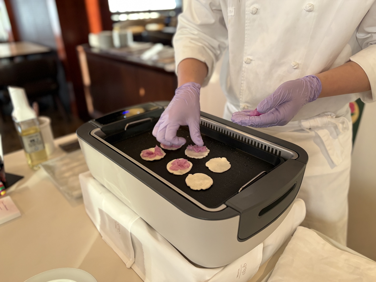 | 지난 15일 서울 중구 웨스틴 조선 서울 20층 웨스틴클럽에서 진행된 한마루 이벤트에서 이정민 셰프가 고객들에게 제공할 진달래꽃 화전을 조리하고 있다. 강승연 기자 |