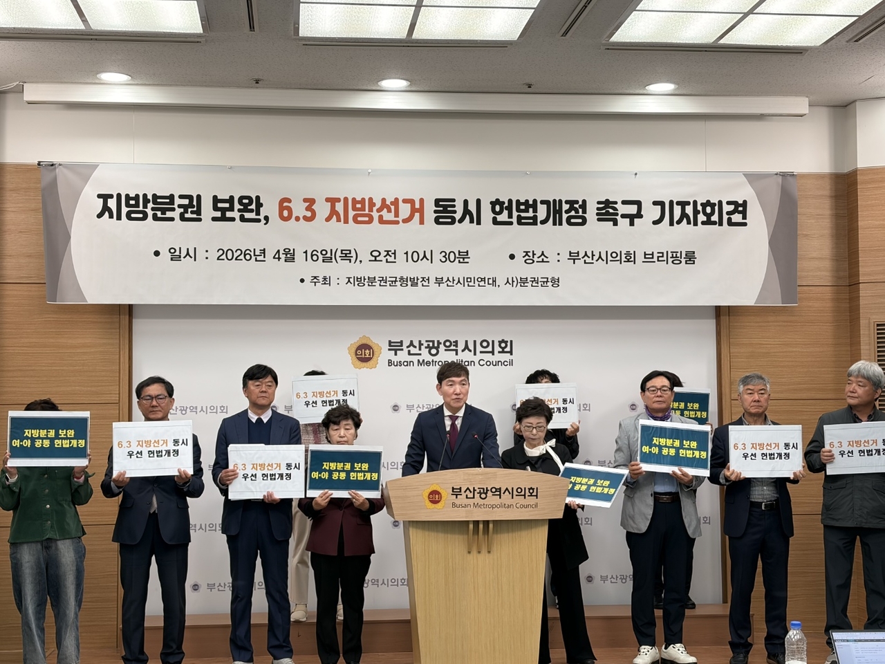 지방분권균형발전부산시민연대와 사단법인 분권균형은 16일 부산시의회 브리핑룸에서 기자회견을 열고 “6개 정당과 무소속 등 국회의원 187명이 발의한 헌법개정안은 지방분권 내용을 반영하지 못하고 있다”며 “즉각 국회의장과 여야 대표가 모여 자치입법권 확대 등 지방분권 내용을 보완해 5월 10일 이전에 개헌안 의결을 반드시 완료하라”고 요청했다.