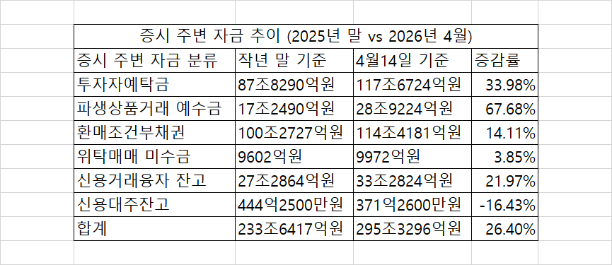 증시 주변 자금은 ▷투자자 예탁금 ▷파생상품거래 예수금 ▷환매조건부채권(RP) ▷위탁매매 미수금 ▷신용거래융자 잔고 ▷신용대주잔고 등을 합산한 지표로, 시장 유동성과 투자 심리를 동시에 보여준다.