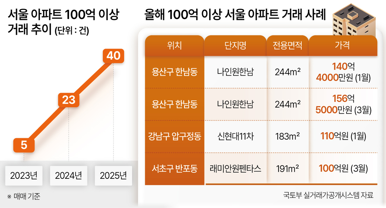 16일 국토교통부 실거래가통계시스템에 따르면 지난해 100억원을 넘긴 서울 아파트 거래는 40건으로 1년 전(23건) 대비 배 가까이 늘었다. 2023년에는 100억원을 넘겨 매매한 계약 건수는 단 5건에 불과했었다. 산술적으론 2년 새 8배가 늘어난 것이다.
