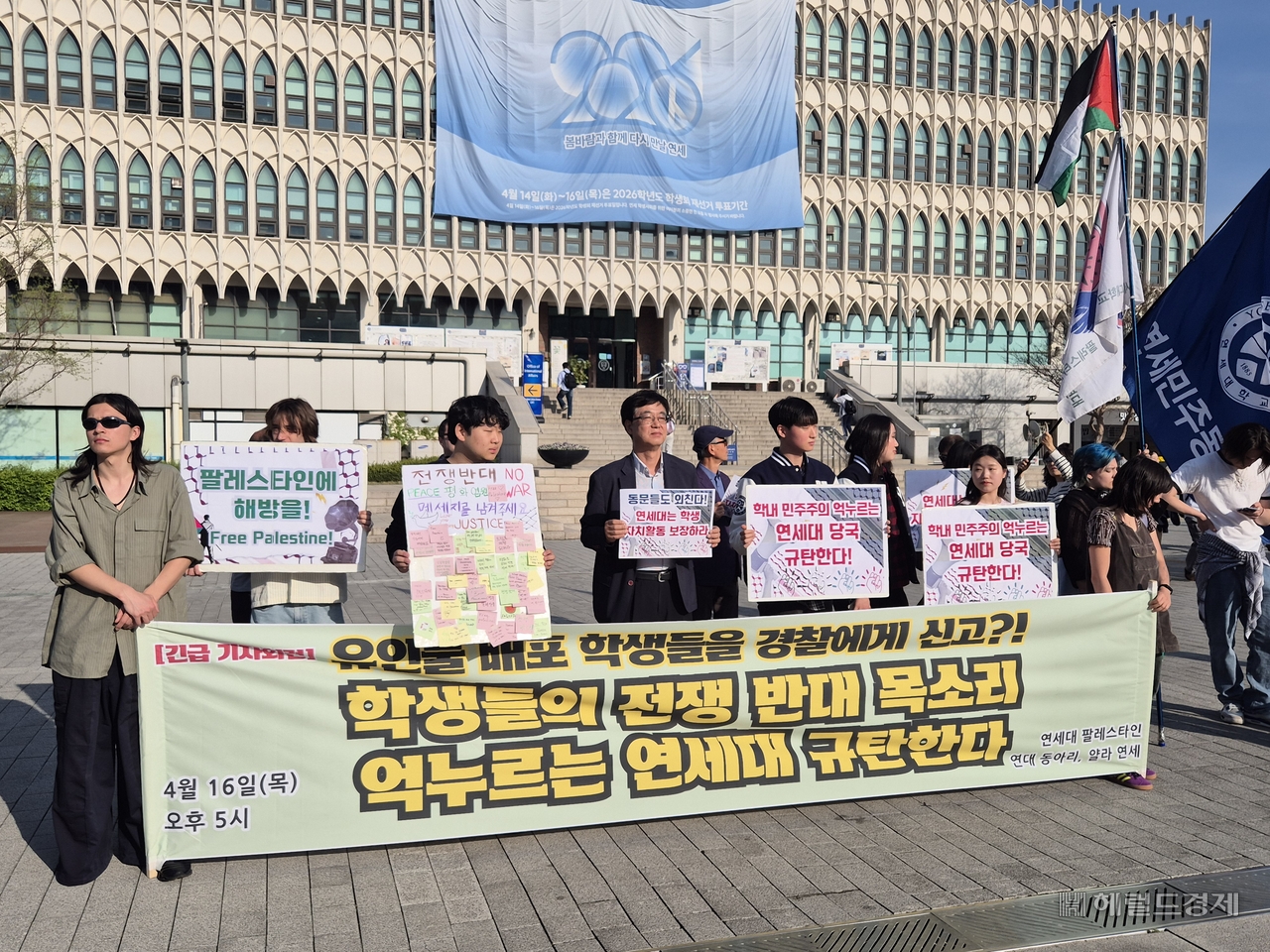 [헤럴드경제=김도윤 기자] 16일 오후 서울 서대문구 연세대학교 학생회관 앞에선 연세민주동문회와 교내 팔레스타인 연대 동아리 ‘얄리 연세’ 소속부원들이 기자회견을 열었다. 하루 전 교내에서 유인물 배포 과정 중 경찰이 출동한 상황을 규탄하기 위함이었다.