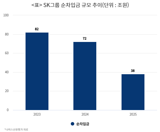 16일 나이스(NICE)신용평가 보고서에 따르면 지난해 말 기준 SK그룹의 순차입금 규모는 38조2000억원이다. 82조원을 기록했던 2023년말 대비 40조원 이상 감소했다.