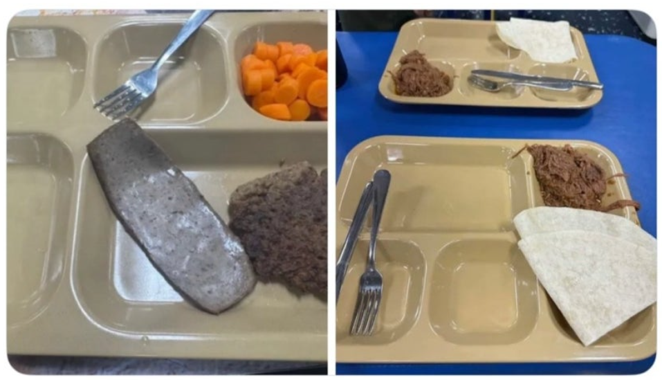 사진을 보면 식판에는 미리 조리된 회색빛 가공육 한조각과 삶은 당근 그리고 마른 패티 한조각만 담겨있었다.