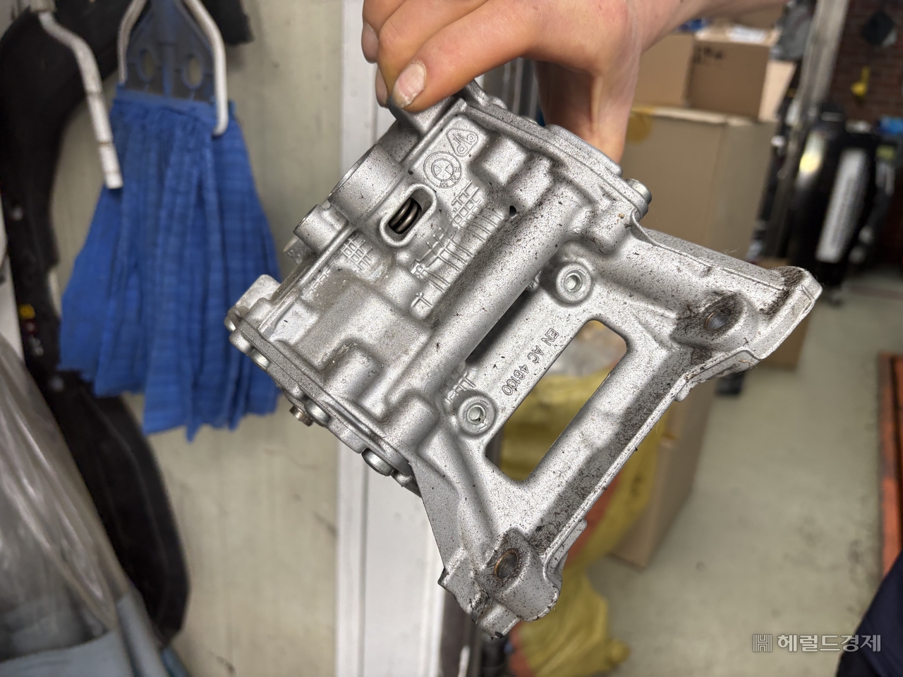 | 한 수리 업체에서 작업 중인 BMW B58 엔진 오일펌프. 내부 부품이 플라스틱으로 제작돼 교체 의뢰가 잇따르고 있다. [정주원 기자] |