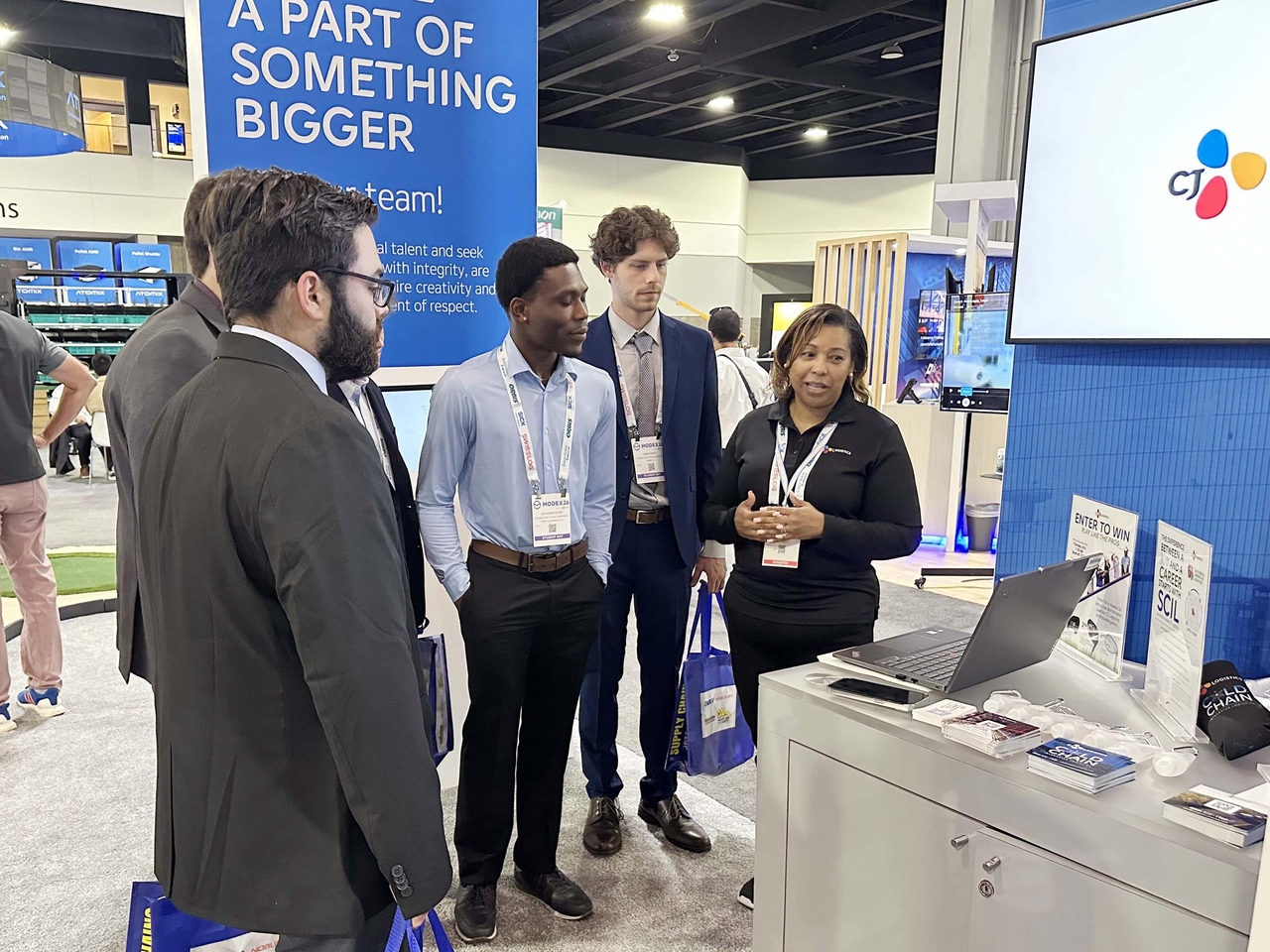 | CJ대한통운 미국법인(CJLA)이 마련한 MODEX 2026 부스에서 회사 관계자가 방문객들에게 기술을 소개하고 있다. [CJ대한통운 제공] |