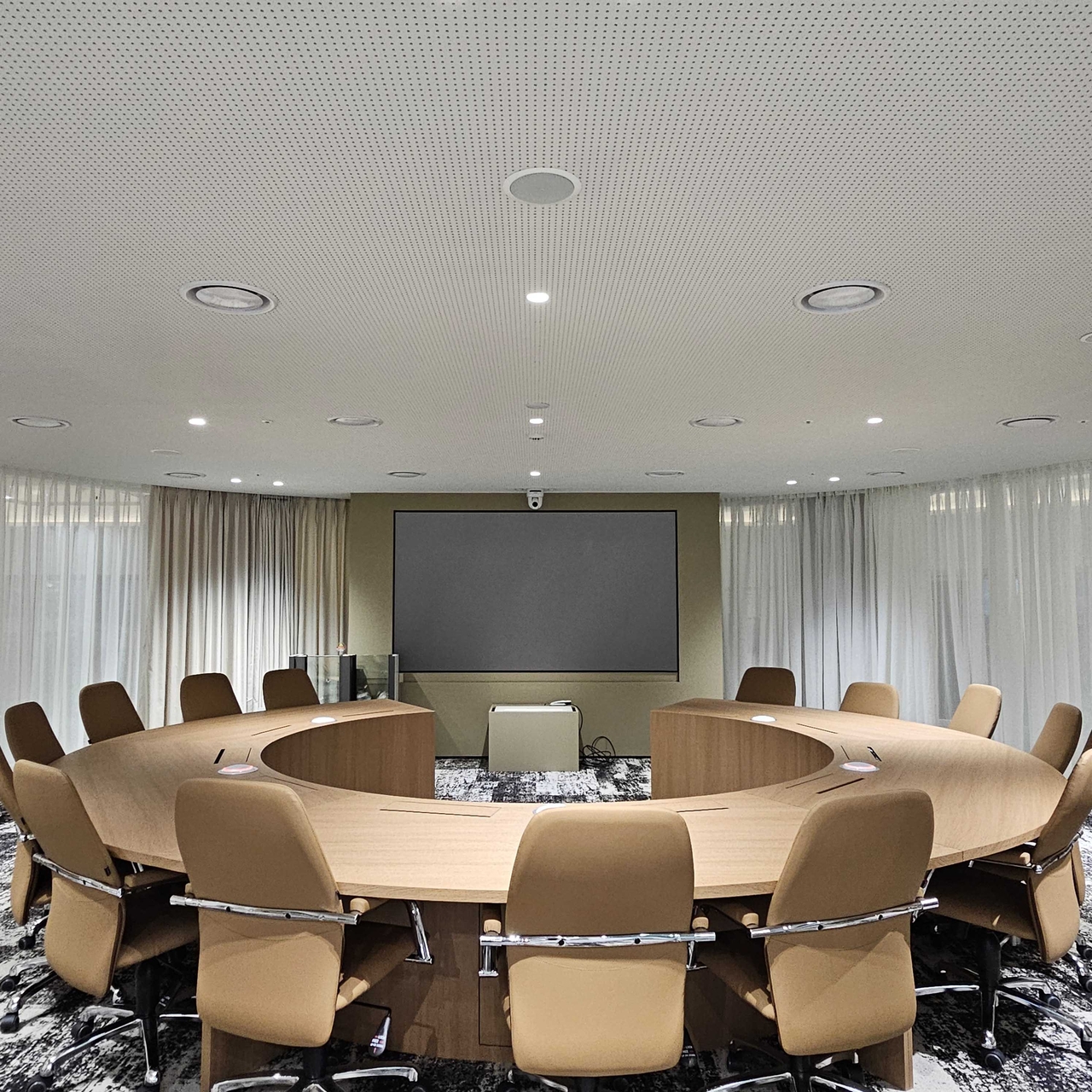 유공 흡음 석고보드는 석고보드 표면에 일정한 타공 패턴을 적용하고 후면에 부직포를 부착해 소리를 흡수하는 구조의 건축자재다. 실내에서 발생한 음파가 벽체와 천장 등에 반사되며 잔향을 형성할 때, 타공 구조를 통해 노출된 후면 부직포가 음파를 흡수해 소음을 줄이는 방식이다. 특히 천장은 실내에서 가장 넓은 반사면으로 꼽혀 흡음 성능이 공간 전체 음향 품질에 미치는 영향이 큰 부위다.