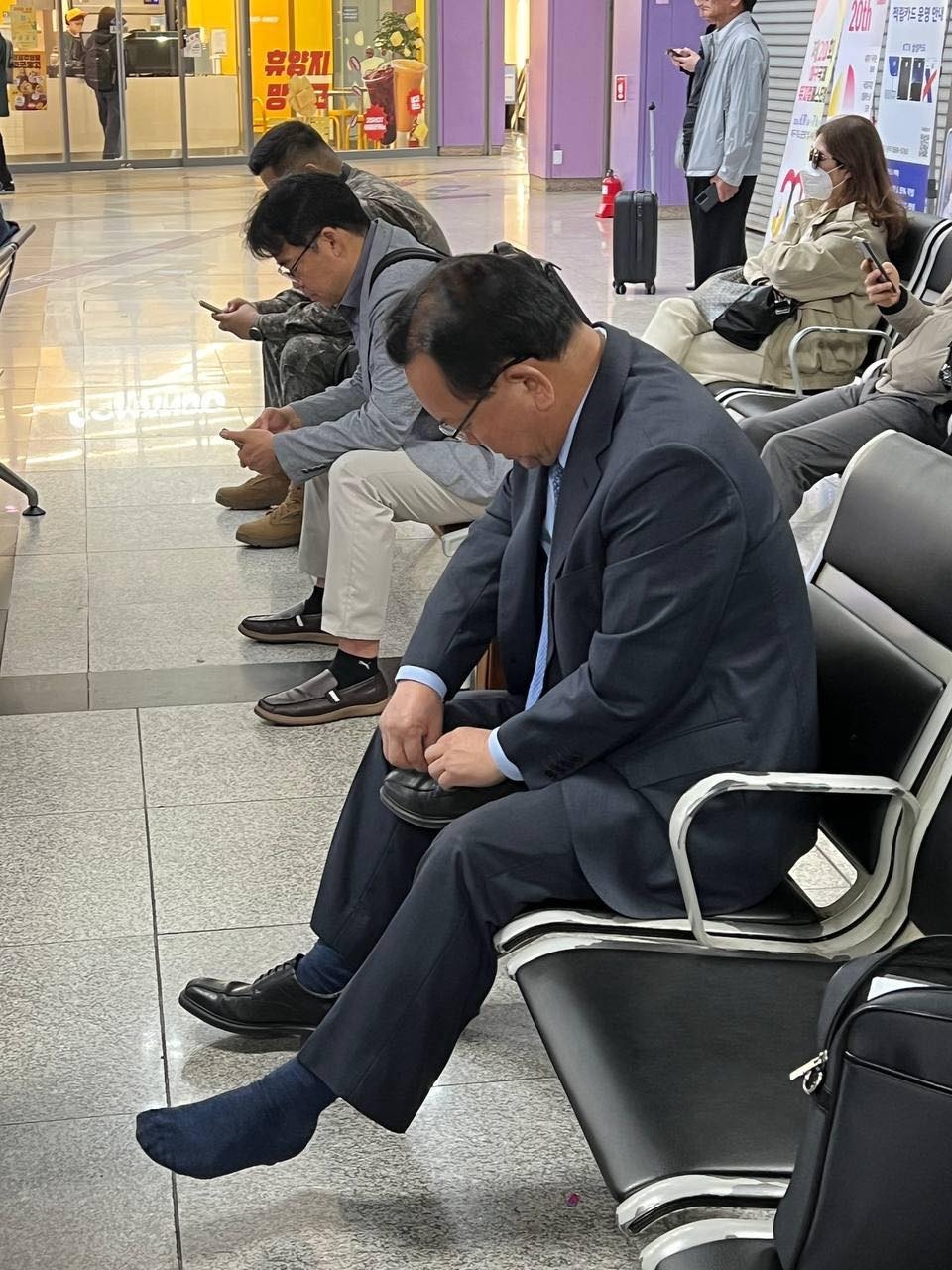 설상가상 구두끈이 끊어져 갈아끼운 일화도 고백했다. 함께 올린 사진엔 그가 왼쪽 신발을 벗고 끈을 끼우고 있는 모습이 담겼다.