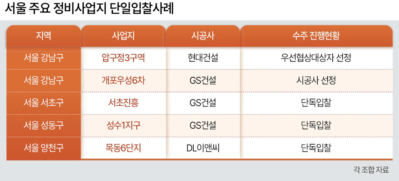 GS건설은 이달 강남구 개포우성6차 재건축 사업에 두 차례 단독 입찰해 수의계약으로 사업권을 확보했다. 지난 1월 선정된 송파구 송파한양2차 재건축 시공사에서도 GS건설은 수의계약을 통해 무혈입성에 성공했다.