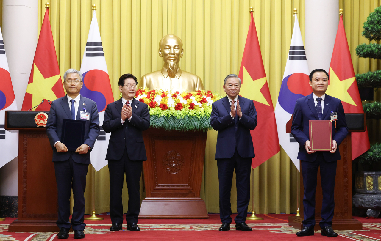 | 김동철 한국전력공사 사장과 레 응옥 썬 베트남 국가산업에너지공사(PVN) 회장이 22일(현지시간) 하노이 주석궁에서 이재명 대통령과 또 럼 공산당 서기장 겸 국가주석이 임석한 가운데 원전 개발 협력 가능성 검토 양해각서(MOU) 교환 후 기념촬영을 하고 있다. [연합] |
