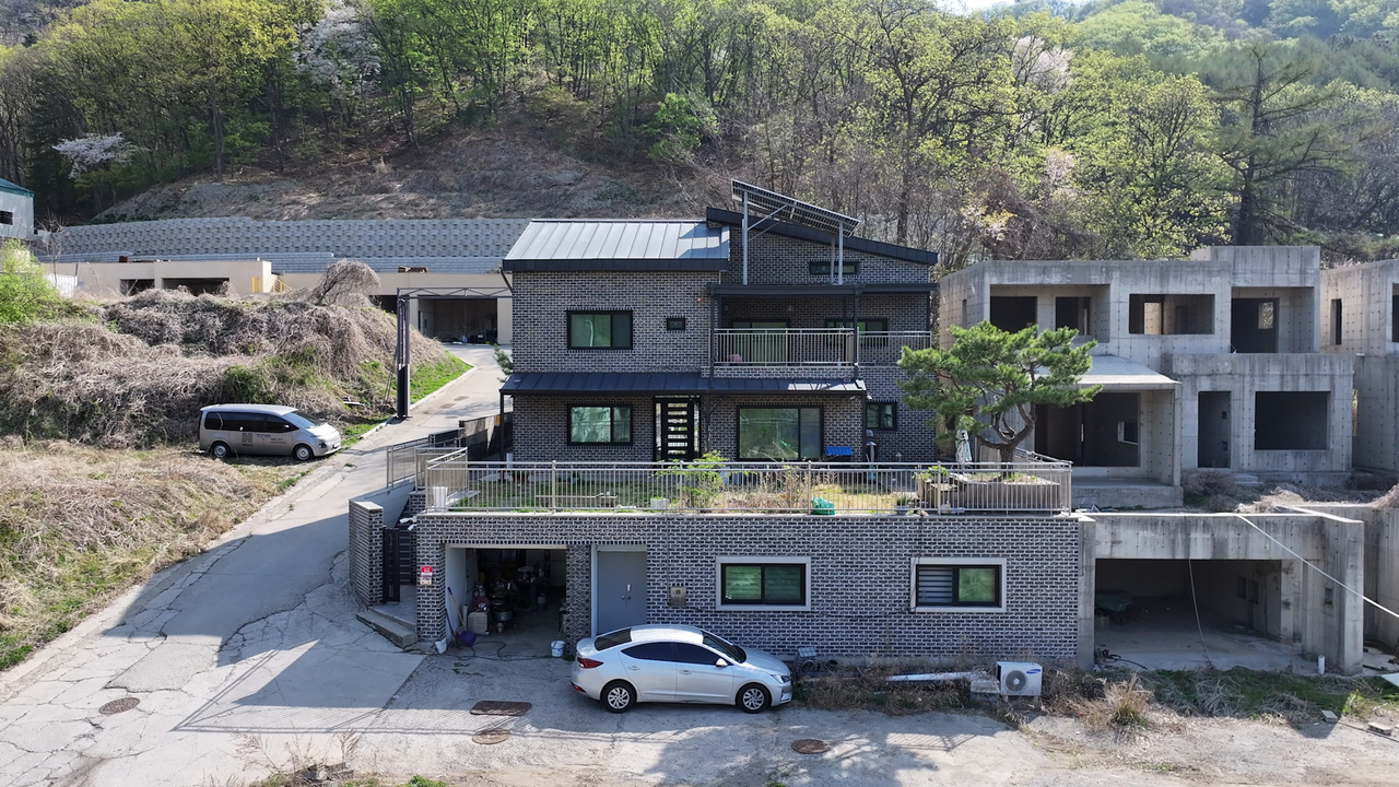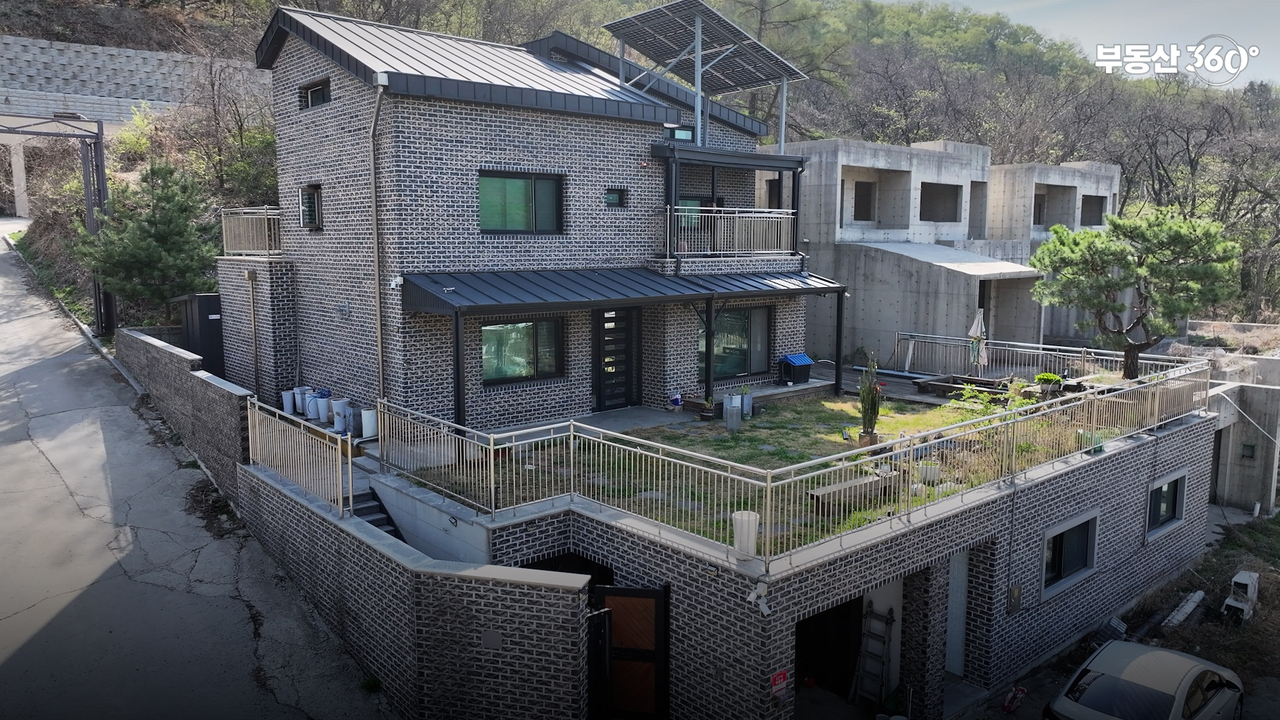 또 경사지를 활용해 지어졌다는 게 이 물건의 특징이다. 도로와 바로 맞닿은 곳에 벙커형 주차 공간이 마련돼 있다. 건물 앞으로는 소나무를 비롯한 조경수가 배치돼있어 쾌적한 환경을 자아낸다. 또 지붕에는 태양광 패널도 설치돼있어 전기료 부담도 덜어줄 수 있을 것으로 보인다.