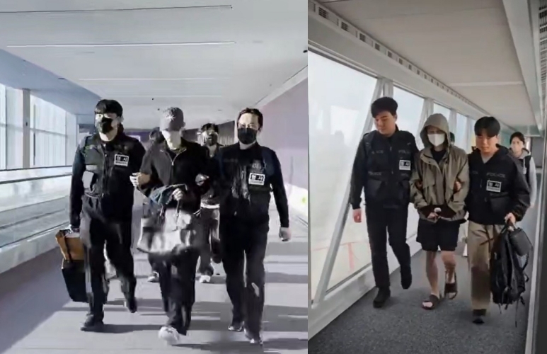 | 지난 3월 4일 ‘송민호파’ 조직원이 인천국제공항을 통해 송환되는 장면(왼쪽). 같은 달 17일 ‘몬돌끼리’ 조직원 국내 송환 장면(오른쪽). [경찰청 제공] |