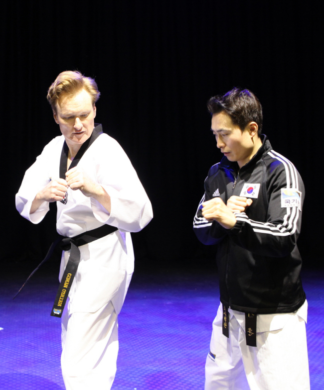 | Conan O’Brien learns taekwondo at Kukkiwon, World Taekwondo Headquarters, in Seoul on Wednesday. (Kukkiwon) |