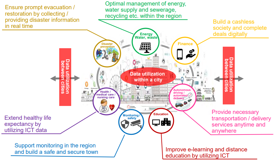 Not only has Japan faced various social challenges such as population decline, aging, disasters, and infectious disease risk, but also digitalization, AI, and IoT are rapidly developing with COVID-19. For that reason, the Japanese government aims to improve the quality of life of citizens and the efficiency of urban activities in creating smart cities. This is an extension of the Social 5.0 (a human-centered society that combines economic development and social task solving through a highly fused system between virtual and real space) proposed by the Japanese government.